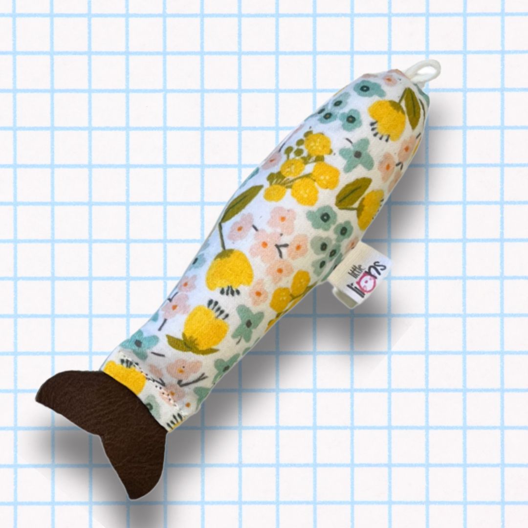 Just thread thru the loop on any regular size catnip fish and tie a knot.  Any regular size fish will attach to this or any line you have